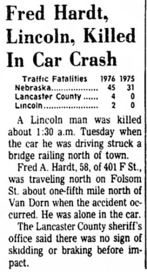 10338. “Fred Hardt, Lincoln, Killed In Car Crash,” Lincoln Journal Star, Lincoln, NE, February 24, 1976, 19.