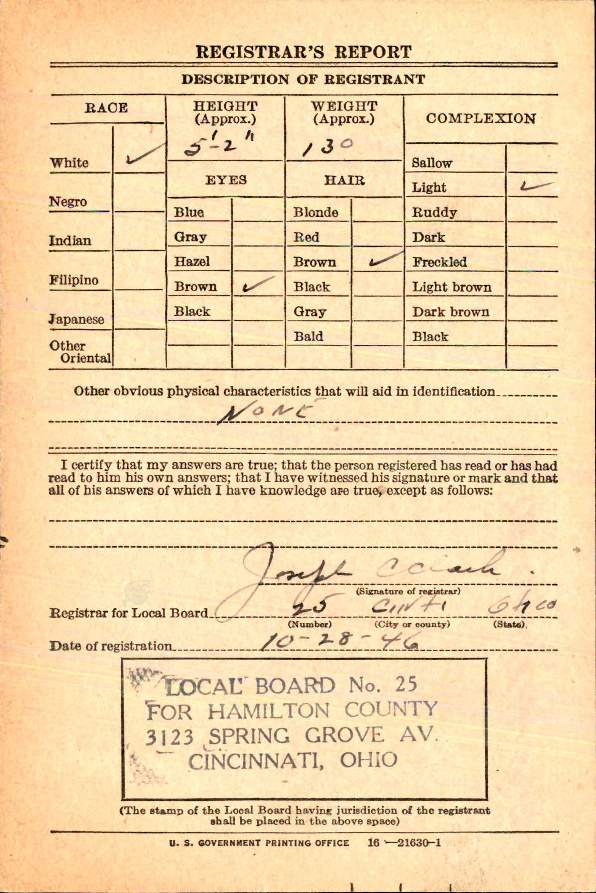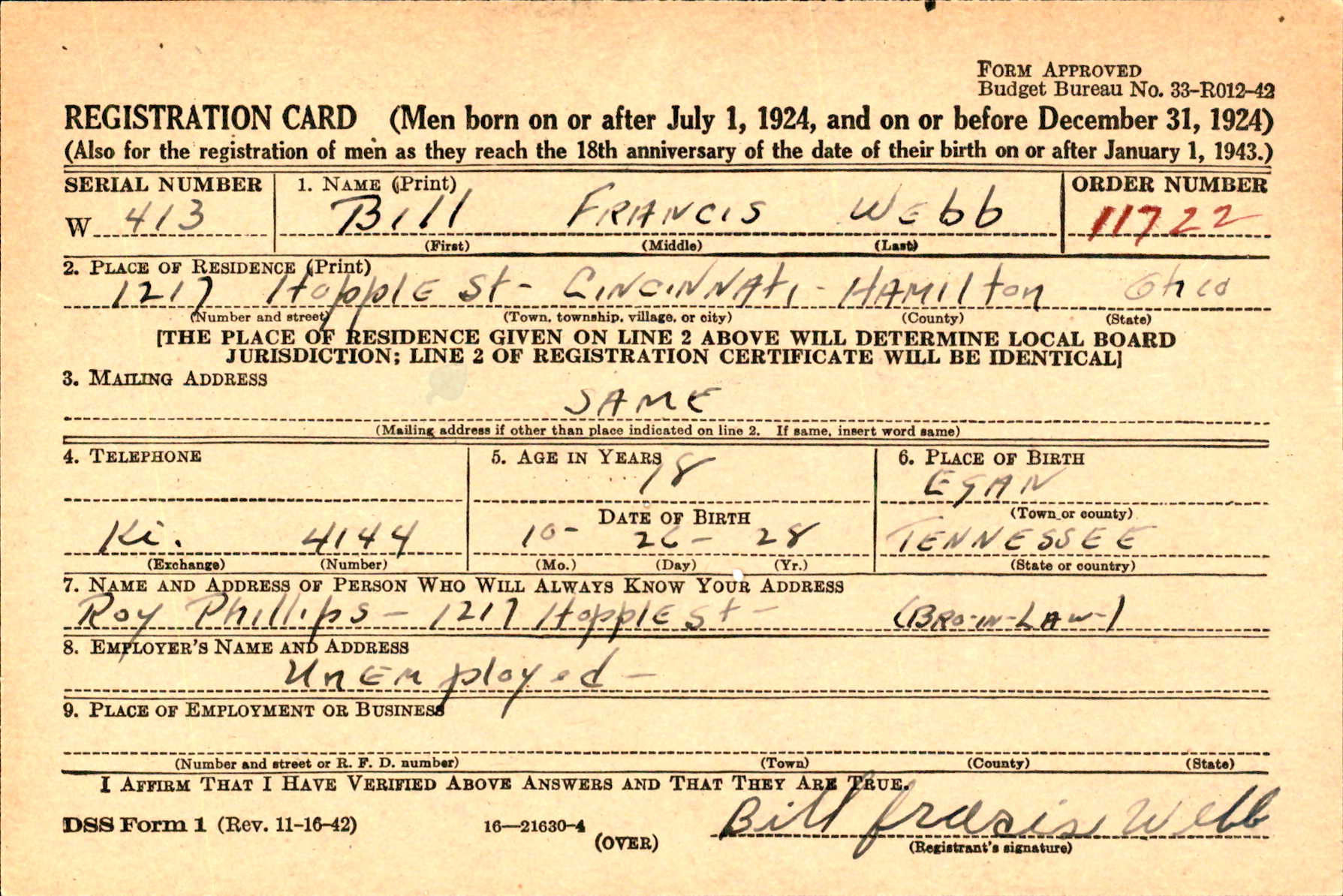 10670. Webb, Bill Francis, World War II, 1946, Ohio, W413, “World War II Draft Cards,” October 28, 1946, Cincinnati, OH, 11722.
