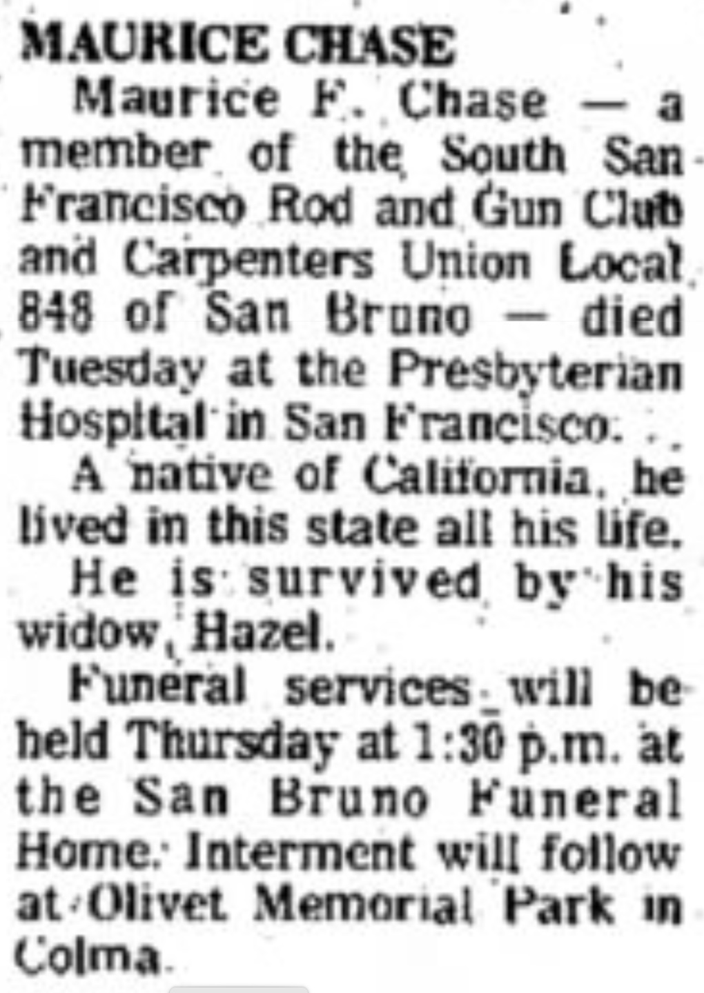 10689. “Deaths,” Maurice F Chase, The Times, San Mateo, CA, February 27, 1974, 18.