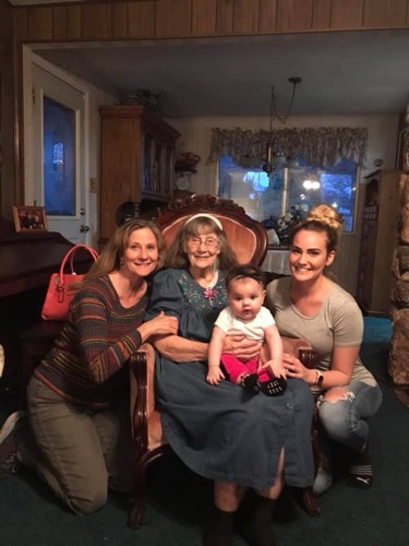 Four Generations from left to right: Lisa Christine (Freeman) Anderson [2], Elizabeth “Bessie” Mae (Whittington) Weston [1], Evelynn Rose Cisneros [4], and Christine (Anderson) Cisneros.